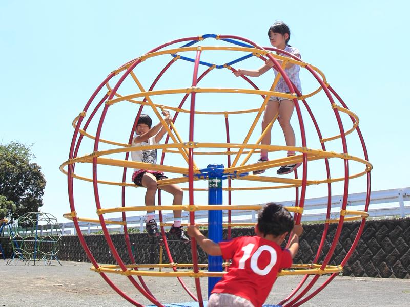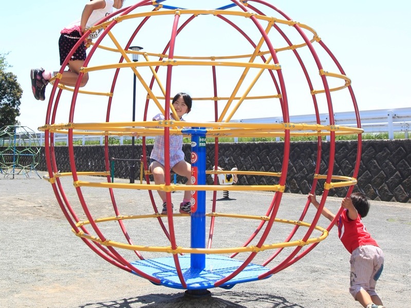 支柱を傷つけることなく「回りすぎ」を防止する、自社開発の特殊回転機構を採用。過度に回転速度があがることがなく、減速も速やかに行えるため、安全に遊べます。球体のジョイント部分には、突起にならない特殊ボルトナットを使用し、子どもたちの身体との衝突や着衣等の引っ掛かりを防止しています。